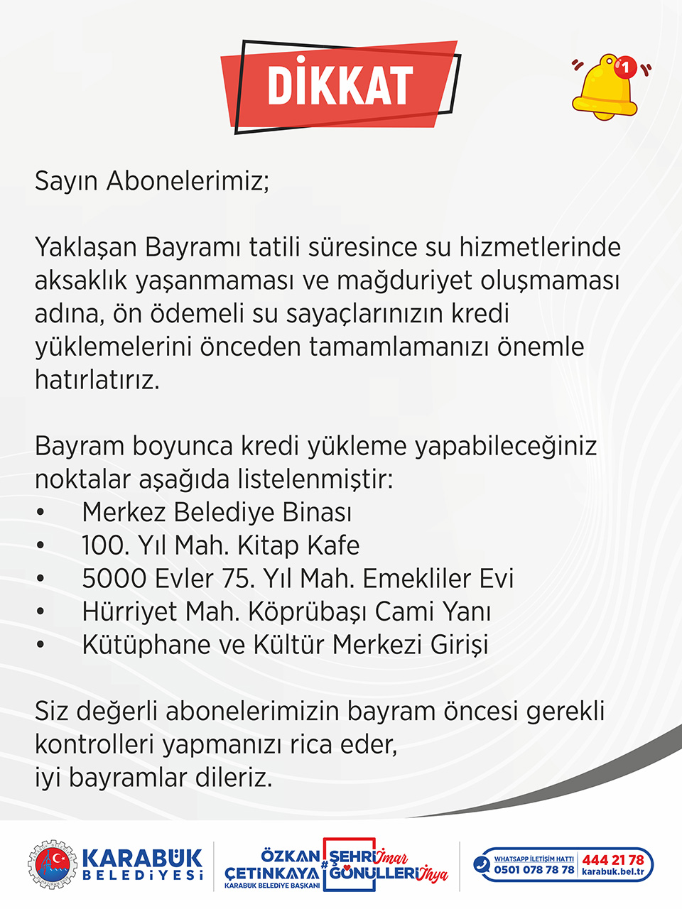 Yaklaşan Bayramı tatili süresince su hizmetlerinde aksaklık yaşanmaması ve mağduriyet oluşmaması adına, ön ödemeli su sayaçlarınızın kredi yüklemelerini önceden tamamlamanızı önemle hatırlatırız.