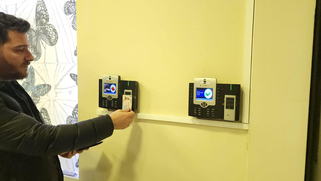 Turnikelerin üzerinde yer alan personel devam kontrol sistemine ait kart okuyucular ise duvara monte edilerek personel giriş çıkış takipleri devam etmektedir.