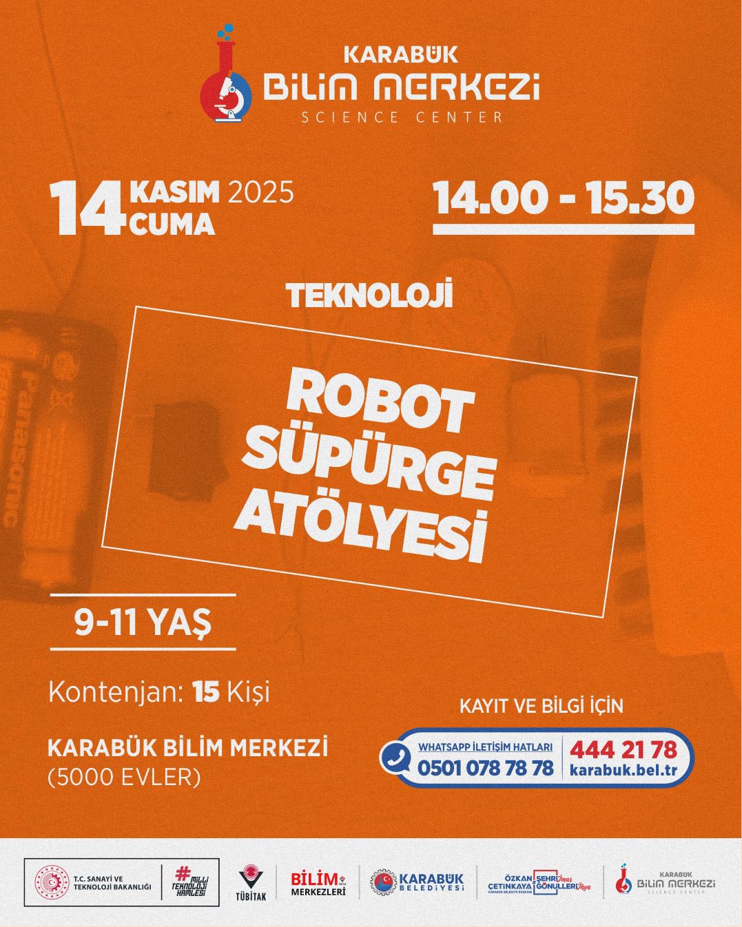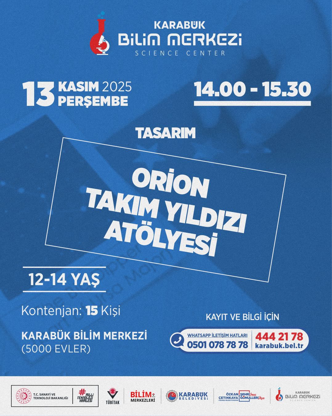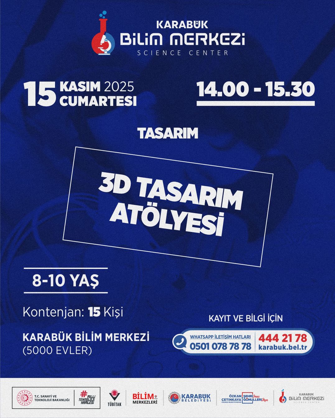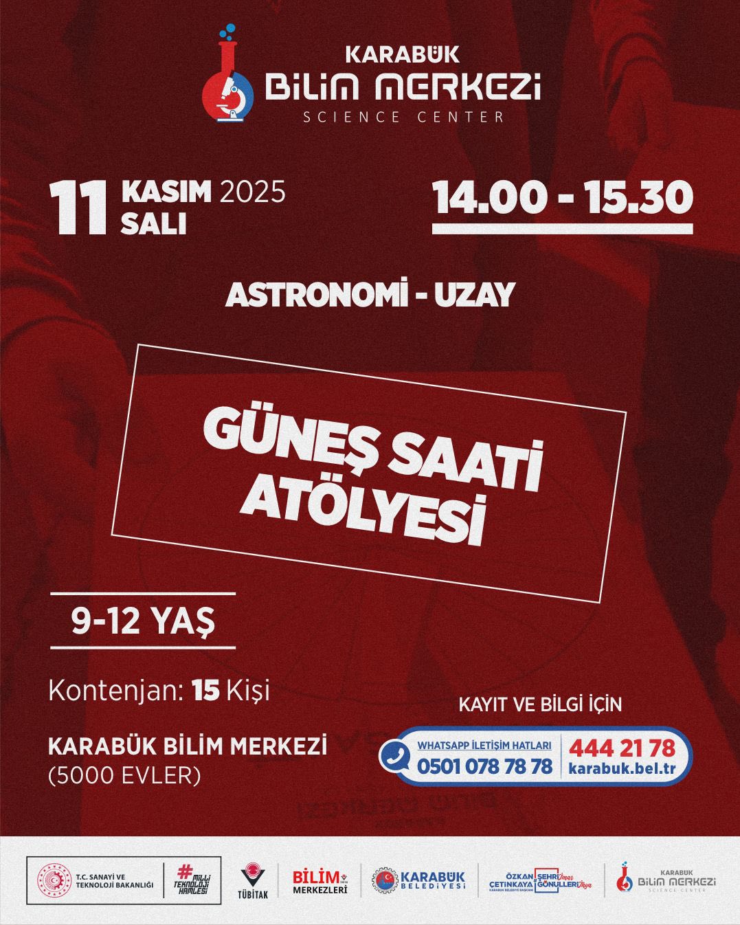 Karabük Belediyesi’ne bağlı Karabük Bilim Merkezi, ara tatil döneminde çocuk ve gençler için dopdolu bir eğitim - etkinlik takvimi hazırladı. 10 - 15 Kasım tarihlerinde gerçekleştirilecek program; bilim, teknoloji, matematik, tasarım ve astronomi alanlarında düzenlenen atölyelerle öğrencileri hem eğlendirmeyi hem de bilimsel farkındalık kazandırmayı hedefliyor.