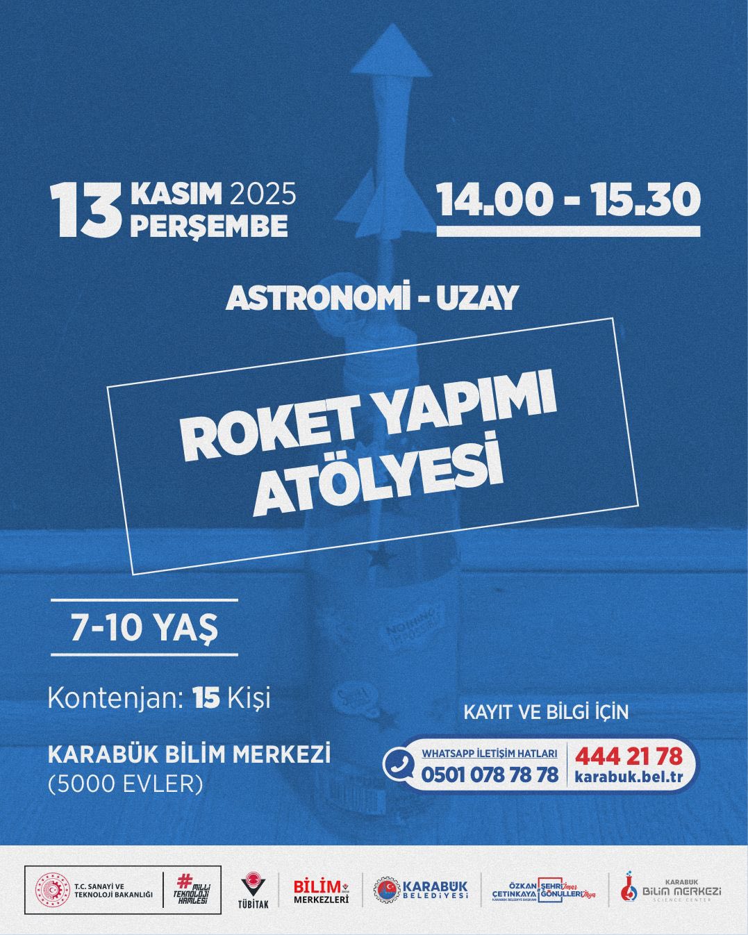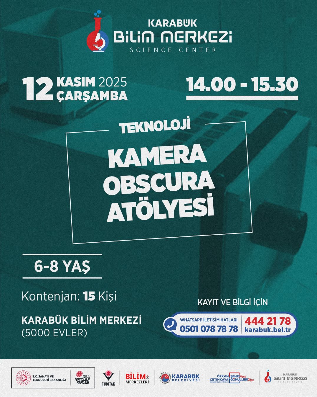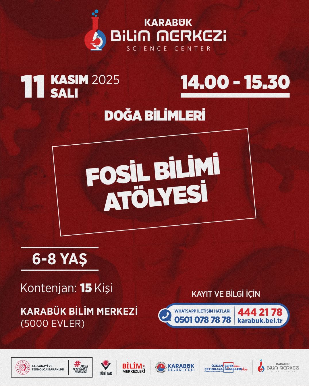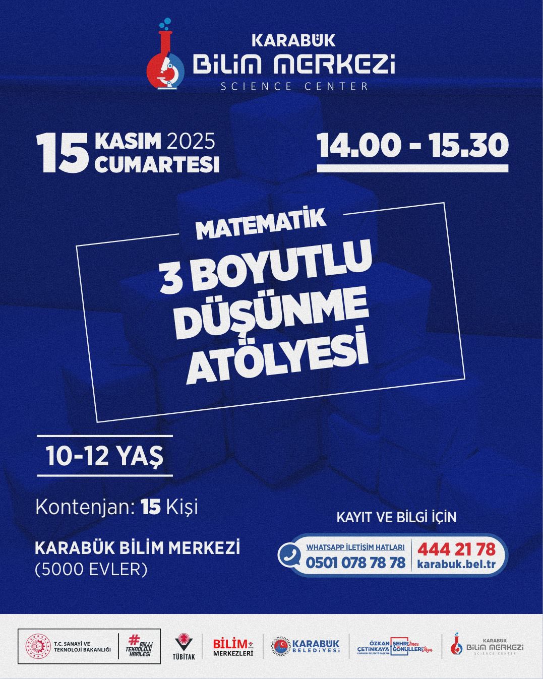 Karabük Belediyesi’ne bağlı Karabük Bilim Merkezi, ara tatil döneminde çocuk ve gençler için dopdolu bir eğitim - etkinlik takvimi hazırladı. 10 - 15 Kasım tarihlerinde gerçekleştirilecek program; bilim, teknoloji, matematik, tasarım ve astronomi alanlarında düzenlenen atölyelerle öğrencileri hem eğlendirmeyi hem de bilimsel farkındalık kazandırmayı hedefliyor.