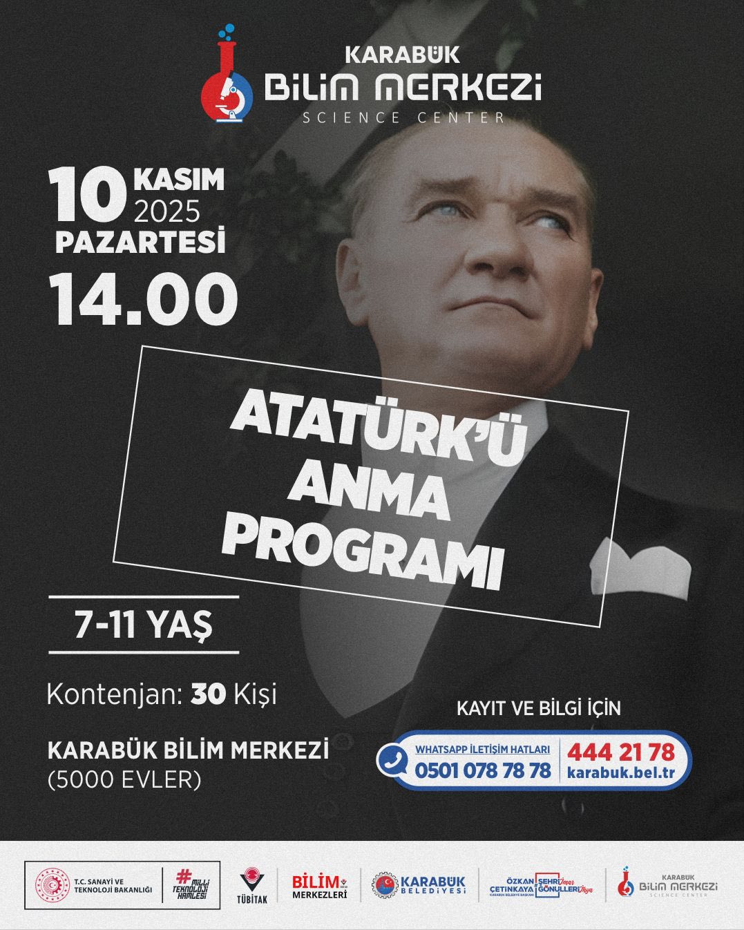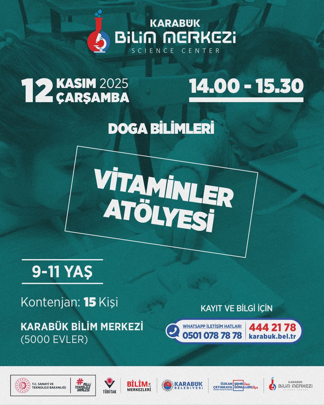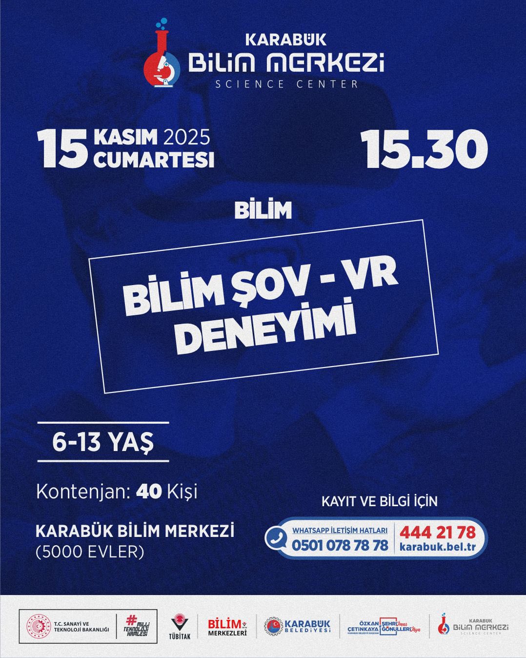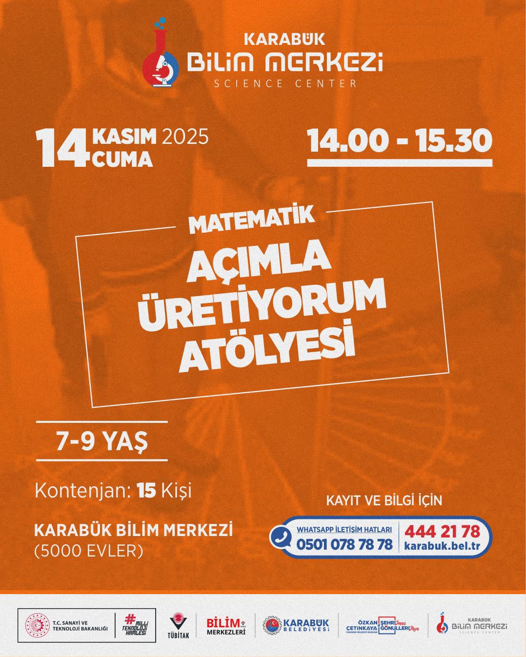Karabük Belediyesi’ne bağlı Karabük Bilim Merkezi, ara tatil döneminde çocuk ve gençler için dopdolu bir eğitim - etkinlik takvimi hazırladı. 10 - 15 Kasım tarihlerinde gerçekleştirilecek program; bilim, teknoloji, matematik, tasarım ve astronomi alanlarında düzenlenen atölyelerle öğrencileri hem eğlendirmeyi hem de bilimsel farkındalık kazandırmayı hedefliyor.