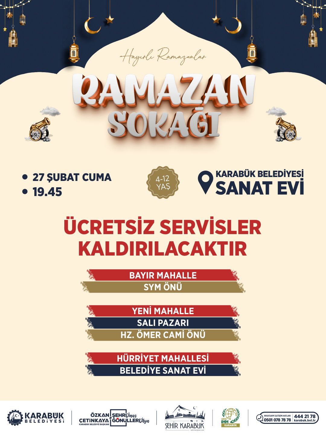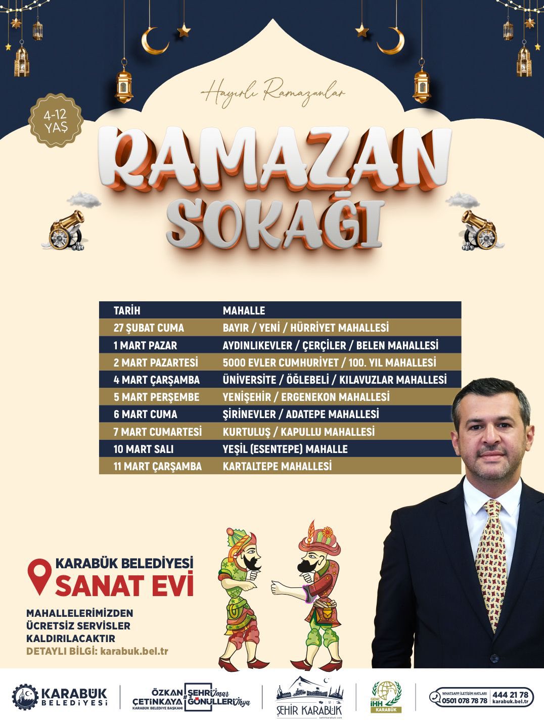Karabük Belediyesi Sanat Evi’nde kurulan Ramazan Sokağı, geleneksel değerlerimizi yaşatan etkinlikleri ve çocuklarımıza özel hazırlanan programlarıyla Ramazan akşamlarına ayrı bir anlam katıyor. Sevdiklerinizle birlikte bu güzel atmosferi paylaşmaya davetlisiniz.