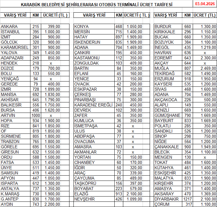 Karabük Belediyesi Denetiminde Çalışan Özel Halk Otobüsü / Ulaşım A.Ş. ve Minibüslerin Fiyat Tarifesi